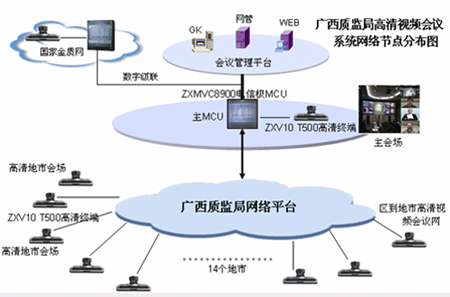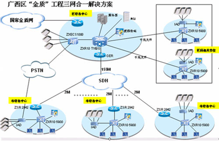 根據(jù)國家“金質(zhì)工程”五年規(guī)劃,結(jié)合廣西壯族自治區(qū)質(zhì)量技術(shù)監(jiān)督局實際情況,廣西“金質(zhì)工程”(一期)的建設(shè)目標非常明確:以區(qū)質(zhì)監(jiān)局為核心,連接3個下屬研究院、14個地市質(zhì)監(jiān)局和1個產(chǎn)品質(zhì)監(jiān)院的質(zhì)監(jiān)業(yè)務(wù)專網(wǎng),支持數(shù)據(jù)、語音和視頻業(yè)務(wù)的統(tǒng)一系統(tǒng)平臺。并以此平臺為基礎(chǔ),實現(xiàn)多業(yè)務(wù)的綜合接入,如質(zhì)監(jiān)信息的建立、管理、查詢,以及IP語音、視頻會議等。