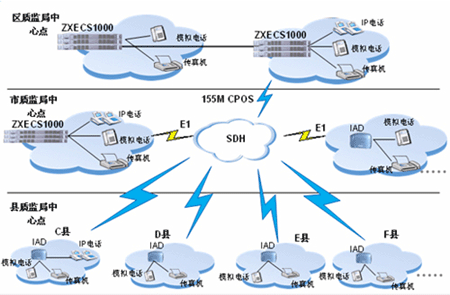其它各接入節(jié)點采用IAD設(shè)備接入到ZXECS 1000,最大程度的降低了語音接入的成本,同時IAD靈活的擴展性利于今后的升級。