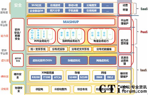 軟件服務(wù)層主要是對用戶提供具體的服務(wù),比如SNS社區(qū)、移動U盤、企業(yè)移動IM等。同時,中興云計算架構(gòu)還提供多層次安全解決方案和管理方案。