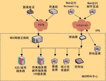 NBX網(wǎng)絡(luò)呼叫中心的核心是3Com公司的NBX網(wǎng)絡(luò)電話交換機(jī),它具有PBX的功能,支持多種外線接入方式,呼入的語(yǔ)音信號(hào)轉(zhuǎn)換為數(shù)據(jù)包,在局域網(wǎng)內(nèi)部傳輸,實(shí)現(xiàn)局域網(wǎng)內(nèi)部語(yǔ)音、數(shù)據(jù)的統(tǒng)一。坐席可以延伸到數(shù)據(jù)網(wǎng)可以達(dá)到的地方(適當(dāng)?shù)膸挘,而不受地理位置的限制。你可以通過(guò)申請(qǐng)各類專線,如VPN、DDN等,將計(jì)算機(jī)連入呼叫中心,實(shí)現(xiàn)分地域、分種類、分?jǐn)?shù)據(jù)的服務(wù)。NBX網(wǎng)絡(luò)呼叫中心擴(kuò)大了對(duì)外服務(wù)方式,通過(guò)上網(wǎng)訪問(wèn)企業(yè)主頁(yè),并使用Windows集成的Netmeeting軟件通過(guò)使用電腦的聲卡、耳機(jī)、麥克風(fēng)直接與服務(wù)代理人員進(jìn)行語(yǔ)音交流。