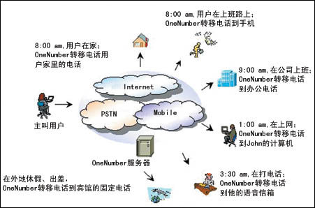 通過OneNumber這一業(yè)務(wù)系統(tǒng),電信運營商可以整合用戶的各種號碼資源,有效留住客戶;用戶只需申請一個OneNumber號碼,無論用戶走到哪里,主叫用戶都可以通過電話、手機、PC等方式撥打該號碼聯(lián)系到用戶。用戶接受信息的手段可以根據(jù)自己的設(shè)定,以電話、手機、短信、PC等方式與主叫用戶建立聯(lián)系,也可以語音信箱的方式收聽留言。
