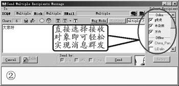 MSN與ICQ都有消息群發(fā)功能。但MSN只能通過“邀請其他聯(lián)系人加入”的方式進(jìn)行,而且有最多加入四人(共五人)的限制。但I(xiàn)CQ的消息群發(fā)功能卻很強(qiáng)大。在對話模式下,單擊“Multiple”即可展開所有好友的列表。沒有人數(shù)限制,也沒有在線與否的限制(如圖2)。