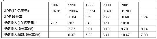 盡管電信運(yùn)營業(yè)存在投資過度,并導(dǎo)致巨額虧損,但是過去幾年世界電信收入的增長率高于GDP,平均為7.8 3%,顯示出電信運(yùn)營業(yè)仍呈現(xiàn)出強(qiáng)勢發(fā)展特征。表中的數(shù)據(jù)表明:電信業(yè)仍是經(jīng)濟(jì)中最具增長力量的部分。