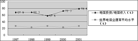 由于電信收入無法實(shí)現(xiàn)高增長,我國電信運(yùn)營商如果繼續(xù)連續(xù)進(jìn)行大規(guī)模投資,將無法收回投資。我國電信運(yùn)營業(yè)的投資一直保持在高水平,2000年度我國電信投資占到電信收入的72.3 %,而世界平均水平為21.9 %。在2001年度,我國電信投資/電信收入的比例高達(dá)78.6 %(依據(jù)CCID數(shù)據(jù)),這樣高的投資比例是不可能維持的。