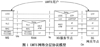 對圖1的簡要描述如下:移動用戶(MS)到RAN左側(cè)部分是無線接入網(wǎng)絡(luò)的無線用戶接口(Uu),實現(xiàn)了用戶業(yè)務(wù)通過空中無線鏈路接入3G網(wǎng)絡(luò)的功能,主要包含物理層(采用WCDMA和TD-CDMA技術(shù))、媒體接入層(MAC)、無線鏈路層(RLC);在RAN內(nèi)部通過協(xié)議中繼(Relay)實現(xiàn)無線鏈路和有線鏈路的對接;在RAN和3G服務(wù)節(jié)點之間的接口(Iu)是以ATM技術(shù)為支撐的有線接入段協(xié)議,為支持Internet業(yè)務(wù),采用AAL5適配層協(xié)議,物理層(L1)無明確限定具體傳輸方式;在此之上,透過RAN、MS和3G服務(wù)節(jié)點之間存在兩個高層連接,即邏輯聯(lián)絡(luò)層(LLC)和更為復雜的第三層實體(L3CE),L3CE是一些以Client/Server方式構(gòu)件的軟件實體,實現(xiàn)諸如無線資源管理、呼叫控制、移動管理等網(wǎng)絡(luò)級功能;在3G服務(wù)節(jié)點內(nèi)部,為實現(xiàn)到Internet網(wǎng)絡(luò)的接入,再作一次協(xié)議中繼,這里,第三層實體的信息映射到通用分組無線服務(wù)的隧道協(xié)議GTP(GPRS Tunneling Protocol);3G服務(wù)訪問點到3G網(wǎng)關(guān)之間的Gn接口存在清晰的、以TCP/IP協(xié)議為主體的五層對應(yīng)關(guān)系;構(gòu)建在最上層的是移動用戶到3G網(wǎng)關(guān)的UMTS用戶進程,它通過3G網(wǎng)關(guān)進入Internet骨干網(wǎng),最終實現(xiàn)用戶對Internet的訪問。