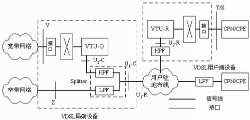 、 VTU-R 分別是位于局端和用戶(hù)端的VDSL收發(fā)器。業(yè)務(wù)分離器(Splitter ,包括HPF和LPF)將同一對(duì)電話(huà)銅纜上傳輸?shù)腣DSL與窄帶業(yè)務(wù)(或ADSL)