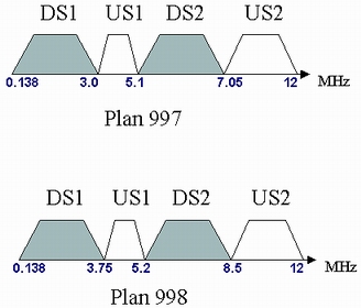 此標(biāo)準(zhǔn)從中國(guó)的實(shí)際情況出發(fā),既適應(yīng)接入網(wǎng)絡(luò)總體流量的非對(duì)稱(chēng)特性,又考慮滿(mǎn)足一些對(duì)上行速率要求較高、接近對(duì)稱(chēng)的業(yè)務(wù)需求;既考慮當(dāng)前技術(shù)和設(shè)備狀況,又兼顧未來(lái)技術(shù)發(fā)展和一段時(shí)期內(nèi)可能的業(yè)務(wù)需求,提出了中國(guó)的VDSL頻段劃分方式。這種方式在Plan998