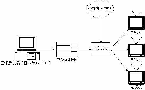 本系統(tǒng)接收端接收實時廣播時,除了用普通PC機(jī)收看,或把PC機(jī)接收到的信號輸?shù)诫娨暎ù笃粒┥鲜湛矗踔吝可以接入有線電視網(wǎng)進(jìn)行播放。具體方法是通過一個接收端接收股評節(jié)目,通過帶TV-OUT的顯卡把TV信號輸出到中頻調(diào)制設(shè)備,中頻調(diào)制設(shè)備可以把基帶模擬信號轉(zhuǎn)換成一個有線電視信號,且傳輸距離遠(yuǎn),損失小,再把這個信號與有線電視信號一起接入一個二分支器(2進(jìn)1出),這就可以和公共有線電視共存,形成自己的頻道,供電視接收。