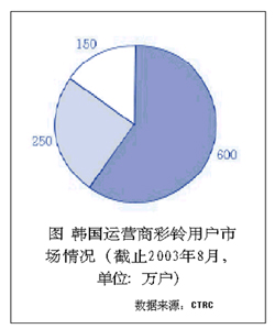 彩鈴業(yè)務(wù)最先是由韓國(guó)的SK電信于2002年3月推出的,業(yè)務(wù)一經(jīng)面世就吸引了移動(dòng)用戶、特別是年青用戶群體的眼球,開(kāi)通的用戶數(shù)和業(yè)務(wù)使用率呈指數(shù)式增長(zhǎng);同時(shí)由彩鈴業(yè)務(wù)帶來(lái)的互聯(lián)網(wǎng)、WAP和IVR的話務(wù)量的增長(zhǎng)進(jìn)一步提升了彩鈴業(yè)務(wù)的含金量。隨后韓國(guó)的其他兩個(gè)移動(dòng)運(yùn)營(yíng)商LG電信和韓國(guó)電信也分別于2002年6月和9月相繼開(kāi)通彩鈴業(yè)務(wù)。經(jīng)過(guò)運(yùn)營(yíng)商和彩鈴的內(nèi)容提供商的前期市場(chǎng)推廣和運(yùn)作,目前已發(fā)展了近1000萬(wàn)用戶,其中運(yùn)營(yíng)商的市場(chǎng)份額如圖所示。