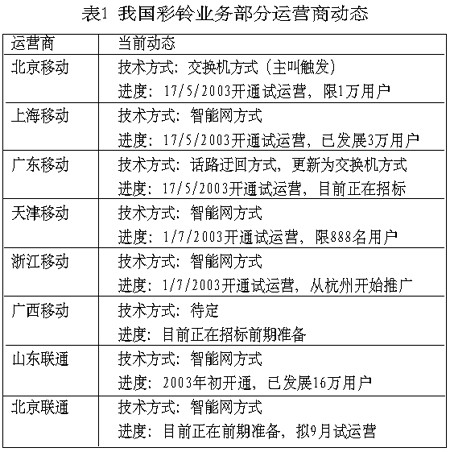 表1總結(jié)了目前我國(guó)部分運(yùn)營(yíng)商彩鈴業(yè)務(wù)的發(fā)展動(dòng)態(tài)。
