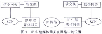 IP中繼媒體網(wǎng)關(guān)在IP網(wǎng)絡和電路交換網(wǎng)絡(SCN)之間提供媒體映射和代碼轉(zhuǎn)換功能,即終止電路交換網(wǎng)絡設施(中繼線路),將媒體流分組化并在IP網(wǎng)絡上傳輸,在IP網(wǎng)絡去往SCN的方向也執(zhí)行類似的功能。IP中繼媒體網(wǎng)關(guān)在網(wǎng)絡中的位置如圖1所示。