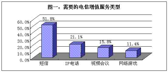 當(dāng)用戶被問(wèn)到“最需要的電信增值服務(wù)是什么?”,在短信、IP電話、視頻會(huì)議和網(wǎng)絡(luò)游戲這四個(gè)備選項(xiàng)當(dāng)中,超過(guò)一半的被訪者選擇短信;其次是IP電話,選擇此項(xiàng)的被訪者占據(jù)21%;再是視頻會(huì)議,選擇此類多媒體通訊方式的被訪者約占16%;最后是網(wǎng)絡(luò)游戲,需要此類增值服務(wù)的人約為10%。(見(jiàn)圖一)