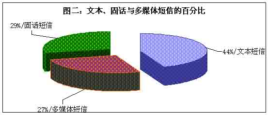 目前市場(chǎng)的主流短信主要有三大類,即傳統(tǒng)的手機(jī)文本短信、流行的圖音文字兼?zhèn)涞摹安市拧焙托峦瞥龅墓淘挾绦。整個(gè)短信市場(chǎng)確實(shí)火了,但是在火爆的背后哪一種短信是真正的巨無(wú)霸?調(diào)查表明,在三類短信之中,選擇文本類短信的用戶最多,占據(jù)44%,其次是固話短信,再次是多媒體短信,即俗稱的“彩信”,選擇固話短信和彩信的百分比十分接近。(見(jiàn)圖二)看來(lái),“巨無(wú)霸”非文本類短信莫屬。
