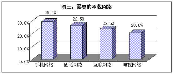 首先,手機(jī)構(gòu)成移動(dòng)的網(wǎng)絡(luò)已經(jīng)超過(guò)傳統(tǒng)的龐大的固話網(wǎng)絡(luò),成為用戶目前用戶最需要的承載網(wǎng)絡(luò)。這顯然是用戶市場(chǎng)對(duì)移動(dòng)通訊方式的需求日漸強(qiáng)烈的表現(xiàn)。其次,電視網(wǎng)絡(luò)拉后于固話和互聯(lián)網(wǎng)絡(luò),排在最后一位,這反映了未來(lái)網(wǎng)絡(luò)向雙向溝通發(fā)展的態(tài)勢(shì)。最后,互聯(lián)網(wǎng)絡(luò)雖然早于移動(dòng)網(wǎng)絡(luò)的發(fā)展,而用戶卻更為看重后者,原因是作為互聯(lián)網(wǎng)絡(luò)終端設(shè)備的電腦,還不能走入普通百姓家庭,因此終端設(shè)備成為互聯(lián)網(wǎng)絡(luò)發(fā)展的門檻。