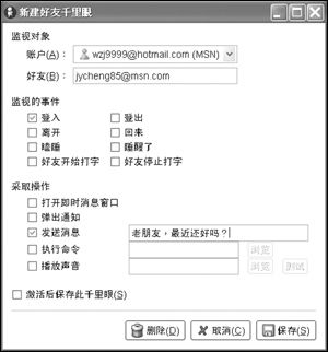 MSN可以在好友登錄時(shí)設(shè)置提示,但卻無法像QQ一樣自動發(fā)出特定問候,這未免有些遺憾。在Gaim中,我們可以為那些暫時(shí)不在線的好友添加千里眼監(jiān)視功能(如圖3),這里可以監(jiān)視的事件包括登入、登出、離開、回來、瞌睡、睡醒了、好友開始打字、好友停止打字等等,而可以設(shè)置的提示方式是打開即時(shí)消息窗口、彈出通知、發(fā)送消息、執(zhí)行命令、播放聲音等等,非常豐富!