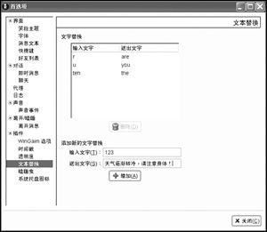 文本替換:根據(jù)用戶自定義的規(guī)則替換發(fā)出的消息,其實(shí)差不多類似于縮寫功能,你可以把一段話定義成一個(gè)字母,以后只要輸入這個(gè)字母,就會直接顯示這段話了。比如在缺省設(shè)置下,輸入“r”即可送出“are”,輸入“u”即可送出“you”(如圖7)。