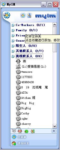 Message、ICQ/AIM的各項(xiàng)通信功能等,可以滿(mǎn)足用戶(hù)日常使用一個(gè)MyIM軟件代替多個(gè)IM客戶(hù)端的使用需求。但是像語(yǔ)音聊天,視頻聊天,短信發(fā)送等時(shí)尚功能比較欠缺。