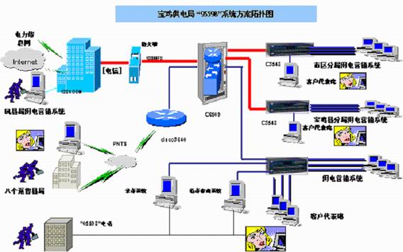 ⑵ 利用現(xiàn)有的計(jì)算機(jī)網(wǎng)絡(luò)基礎(chǔ)實(shí)現(xiàn)市區(qū)供電分局、寶雞縣供電分局、鳳縣供電分局三個(gè)供電分局與局客戶服務(wù)中心的信息聯(lián)結(jié);