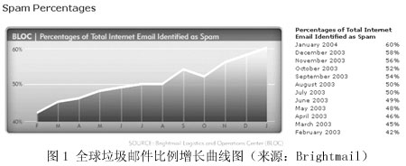 圖1來自著名的反垃圾郵件先鋒Brightmail公司的網(wǎng)站,顯示了最近12個月來,全球范圍內(nèi)垃圾郵件在所有郵件中所占比例的增長曲線圖。按Brightmail的統(tǒng)計(jì)結(jié)果,2003年3月,垃圾郵件在全球郵件總量中的比例是45%,其后的一年間,平均每個月增長兩個百分點(diǎn)。到了今年2月,這個比例已經(jīng)達(dá)到62%,也就是說,現(xiàn)在全球每5封電子郵件中就有3封是有害無益的垃圾郵件。