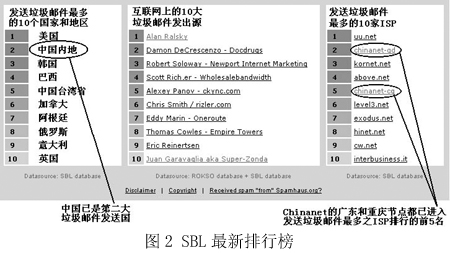 圖2是國際上著名的反垃圾郵件組織Spamhaus在網(wǎng)站上列出的統(tǒng)計(jì)排行榜,“China”已經(jīng)穩(wěn)居第二大垃圾郵件發(fā)送國的位置,而右邊的一個排行榜則從另一個角度向我國敲響了警鐘——在專為發(fā)送垃圾郵件的ISP所列的黑名單SBL中,我國Chinanet的兩個省級ISP在前10名中分列第2和第5名。而Chinanet作為中國的公用信息互聯(lián)網(wǎng)絡(luò),是我國的Internet骨干網(wǎng),是國內(nèi)用戶接入互聯(lián)網(wǎng)的主要途徑之一。“我們真不希望以這樣的方式‘揚(yáng)名海外’”,來自一家ISP的一位不肯透露姓名的女士說,“其實(shí)我們也是受害者!”