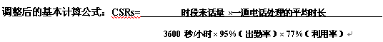 對于任何呼叫中心,由于培訓(xùn)、會議、休息等原因,客戶服務(wù)代表不可能用全部出勤的時間來接聽電話,客戶服務(wù)代表的利用率不可能達到100%,因此,依據(jù)客服中心的行業(yè)標準,考慮出勤率和人員利用率;經(jīng)過調(diào)整后計算公式如下: