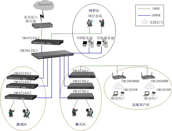 本方案采用"千兆光纖干線,百兆交換到桌面"的設(shè)計(jì)思路,各骨干線路均為1000M。骨干網(wǎng)通過(guò)高速線路接入INTERNET,網(wǎng)吧內(nèi)實(shí)現(xiàn)主干千兆交換、百兆到點(diǎn),整個(gè)網(wǎng)吧內(nèi)實(shí)現(xiàn)無(wú)阻塞通信。根據(jù)顧客的不同消費(fèi)需求,將網(wǎng)吧分為了網(wǎng)絡(luò)游戲區(qū)、聊天區(qū)、貴賓區(qū)等,根據(jù)不同區(qū)域的特點(diǎn),細(xì)化了不同網(wǎng)絡(luò)的解決方案。方案中采用的核心設(shè)備和二層設(shè)備都支持802.1Q標(biāo)準(zhǔn)VLAN和IGMP組播協(xié)議,為VOD、多媒體娛樂等豐富應(yīng)用的開展打下了堅(jiān)實(shí)的基礎(chǔ) 。通過(guò)劃分VLAN,MAC地址綁定來(lái)劃分了不同類型用戶,很好地滿足網(wǎng)吧的各項(xiàng)業(yè)務(wù)應(yīng)用需求。此外,SMC的豐富無(wú)線網(wǎng)絡(luò)產(chǎn)品可以很靈活的滿足網(wǎng)吧的組網(wǎng)需求,投資少、施工快。在提供高性能的同時(shí),還保證很好的安全性,既支持基于802.11b標(biāo)準(zhǔn)的安全機(jī)制,又支持動(dòng)態(tài)安全鏈路,以及基于802.1x的增強(qiáng)性安全或認(rèn)證功能。