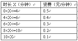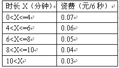 例3,國內(nèi)長途話費在時長不超過4分鐘的情況下,按0.07元/6秒收。怀^4分鐘但不超過6分鐘,統(tǒng)一按0.06元/6秒收;超過6分鐘但不超過8分鐘,統(tǒng)一按0.05元/6秒收;超過8分鐘但不超過10分鐘,統(tǒng)一按0.04元/6秒收。怀^10分鐘,統(tǒng)一按0.03元/6秒收取。