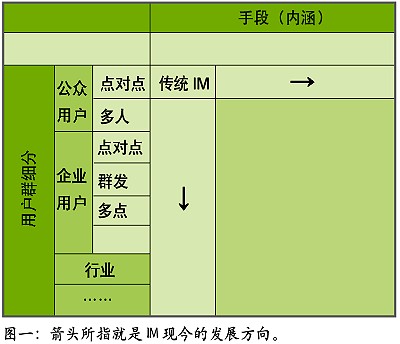 IT行業(yè)發(fā)展數(shù)十年,有一個(gè)共識(shí),或是一種經(jīng)驗(yàn)結(jié)論,大約是:在用“老工具解決新問(wèn)題”、“老工具解決老問(wèn)題”、“新工具解決老問(wèn)題”、“新工具解決新問(wèn)題”四者中,一般最先者最善,也極討巧,最后者則最為事倍功半。觀IM發(fā)展趨勢(shì),似乎介于“新工具解決老問(wèn)題”、“新工具解決新問(wèn)題”二者之間,就體現(xiàn)在表中兩個(gè)箭頭上,是以錢(qián)景堪憂。