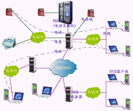 3UCS秉承便捷溝通、高效辦公之理念,將企業(yè)語音通訊、數(shù)字通訊整合在同一通訊線上,將電話交換機功能延伸至IP網(wǎng)絡,電話與傳真線路共享,有效利用線路資源,無縫連接三個網(wǎng)絡(電話網(wǎng)、局域網(wǎng)、因特網(wǎng)),將電話交換機、傳真服務、消息等功能集于一身, 利用現(xiàn)有的局域網(wǎng)、因特網(wǎng)接打電話,收發(fā)傳真。