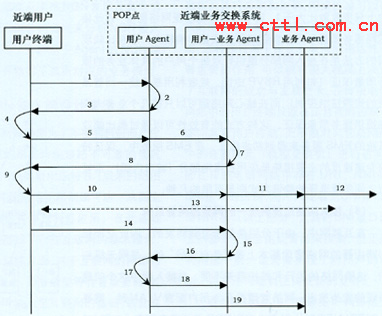在POP點處,每類業(yè)務(wù)有一個“業(yè)務(wù)Agent”,其生命周期與運營商此類業(yè)務(wù)的生命周期相同,即從運營商開通此類業(yè)務(wù)到運營商終止提供此類業(yè)務(wù)為止,因此“業(yè)務(wù)Agent”基本上是長期存在的。“業(yè)務(wù)Agent”負責對不同用戶的同類業(yè)務(wù)進行匯聚,統(tǒng)一與遠端的“業(yè)務(wù)Agent”進行業(yè)務(wù)交互。