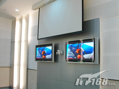 在副會(huì)場(chǎng)方面,和主會(huì)場(chǎng)區(qū)別不大,不過(guò)比主會(huì)場(chǎng)要光亮一點(diǎn),面積也小了很多,所以主顯示系統(tǒng)只需要SONY PX40正面投影(120寸)就可以搞定。VPL-PX40可以多種方式安裝,包括桌面正投,吊頂及背投。供選購(gòu)的兩款鏡頭擴(kuò)展了安裝的靈活性。中央控制開(kāi)關(guān)功能讓用戶能通過(guò)中央電源開(kāi)關(guān)直接開(kāi)關(guān)投影機(jī)。VPL-PX40還配備了獨(dú)特的密碼認(rèn)證系統(tǒng),采用SONY液晶板的新型光學(xué)系統(tǒng),結(jié)合265W UHP燈泡,VPL-PX40/PX35的輸出亮度高達(dá)3500ANSI流明,能在較明亮的環(huán)境下提供出色的畫面質(zhì)量及對(duì)比度。