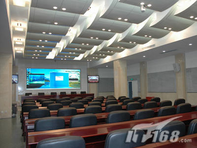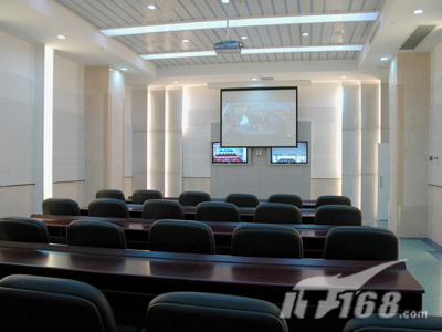 下面先看看主會(huì)場(chǎng)的效果,這會(huì)議的裝修設(shè)計(jì)比較大氣簡(jiǎn)約,中間是主席臺(tái),主顯示系統(tǒng)安裝的是BARCO(巴可)G5投影機(jī),兩側(cè)各設(shè)置一臺(tái)三星50寸等離子顯示器,可根據(jù)需要分別顯示相同或不同的圖像,大屏幕是DNP 120英寸光學(xué)背投屏幕,保證會(huì)議廳的每個(gè)人都能清楚地看到。