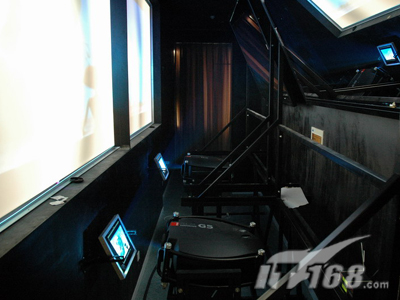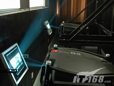 為了達(dá)到足夠大的尺寸,主屏幕采用SEAPRINE圖像控制器組成的1*2拼接,也就是采用了兩臺(tái)BARCO G5投影機(jī)來(lái)確保畫面的一流效果。不過(guò)由于投影距離的限制,這個(gè)方案里采用了二次反射系統(tǒng)。這也是這套方案的一個(gè)要點(diǎn)和關(guān)鍵。因?yàn)楹芏喙こ處熇靡恍└怕蕘?lái)估算一次或多次折射可以縮短的投影距離,但欠缺科學(xué)和嚴(yán)謹(jǐn)?shù)膽B(tài)度,因?yàn)檫@個(gè)數(shù)據(jù)與屏幕安裝高度、投影方式(離軸或偏軸)、投影機(jī)體積、反射鏡面積等息息相關(guān)。