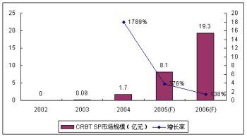在運(yùn)營商的大力推動(dòng)和SP/CP的積極努力下,無線音樂市場從2004年起進(jìn)入了井噴時(shí)期。CRBT業(yè)務(wù)具有的病毒式營銷特性使得CRBT業(yè)務(wù)的滲透率增長迅速,但其時(shí)尚特性又使得業(yè)務(wù)的滲透率高峰很容易達(dá)到、業(yè)務(wù)縱深有限。2005年,CRBT的SP市場規(guī)模增長率為376%,較上一年的高速增長有所回落。諾盛預(yù)計(jì)2006年運(yùn)營商和SP/CP仍然會(huì)力推CRBT業(yè)務(wù)。在產(chǎn)業(yè)鏈積極推動(dòng)和用戶滲透率高峰已經(jīng)逼近的雙重制約下,諾盛預(yù)計(jì)CRBT業(yè)務(wù)的SP市場規(guī)模增長率為138%,整體SP市場規(guī)模達(dá)到19.3億元。