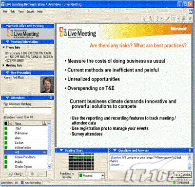 Microsoft Office Live Meeting實(shí)時(shí)會(huì)議:它使Web會(huì)議變得容易,它提供一個(gè)互動(dòng)的Web空間進(jìn)行會(huì)議。在Web空間上面,參會(huì)人員能共享文件、音頻視頻流、以及協(xié)同工作。通過(guò)Live Meeting實(shí)時(shí)會(huì)議,同事們可以使用 Microsoft Office PowerPoint來(lái)作集體討論、編輯Word文檔、敲定Excel上的數(shù)字。通過(guò)統(tǒng)一通信服務(wù)系統(tǒng)的配對(duì), Live Meeting 和 Microsoft Office 就能實(shí)時(shí)協(xié)同。(圖7)