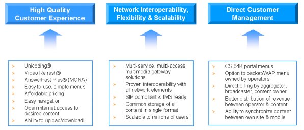 雖然視頻和多媒體服務(wù)的突然火熱對消費者、企業(yè)和業(yè)界來說都是件好事,但存在的挑戰(zhàn)還是很多,如怎樣提供高質(zhì)量的用戶體驗、解決手機和網(wǎng)絡(luò)可互操作性問題,以及集成商、廣播媒體和內(nèi)容提供商的直接用戶接觸與管理問題。這些問題的主要技術(shù)解決方案提供者有Unicoding®、Video Refresh®和AnswerFast Plus® (MONA的一部分),同時多媒體網(wǎng)關(guān)解決方案也包括在內(nèi)。其它方面的可互操作性和用戶體驗改善問題很容易能解決,對今天現(xiàn)有的WAP服務(wù)是一種補充。