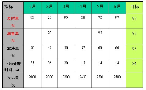 及時(shí)率:雖然在6月達(dá)到了97%,高于目標(biāo)值95%,但從1-6月份波動(dòng)的情況來(lái)看,其表現(xiàn)為大幅波動(dòng),我們認(rèn)為此指標(biāo)處理失控狀態(tài),是沒(méi)有管理的或管理是無(wú)效的,必須加強(qiáng)管理;