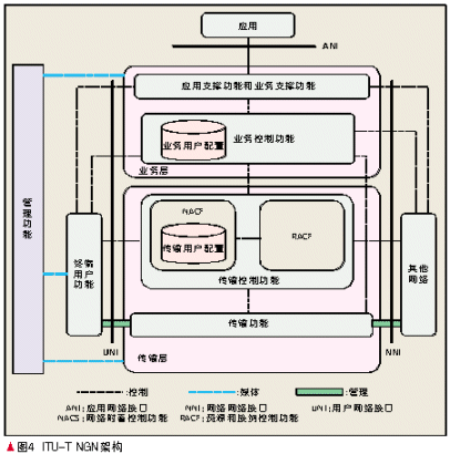 ITU-T下一代網(wǎng)絡的主要架構如圖4所示,NACF是NGN傳輸層的功能實體,正對應于TISPAN NGN架構中的NASS。