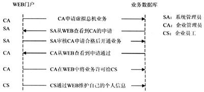 虛擬總機(jī)系統(tǒng)開戶流程采用WEB方式實(shí)現(xiàn),以此完成用戶對(duì)虛擬總機(jī)業(yè)務(wù)的定購、系統(tǒng)管理員對(duì)用戶開戶申請的審核、用戶業(yè)務(wù)參數(shù)的控制等操作,最后企業(yè)員工可以在企業(yè)管理員許可業(yè)務(wù)后,登陸WEB門戶管理個(gè)人信息。具體流程如圖2所示。