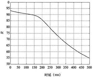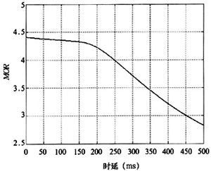 對實時的語音和視頻業(yè)務來說,業(yè)務數(shù)據(jù)端到端的時延最為關鍵,從仿真結果圖6和圖7可以看出時延對R系數(shù)和MOS值的影響:隨著時延的增加,R系數(shù)和MOS值都降低,即語音質(zhì)量變差。當時延大于150ms時,語音質(zhì)量下降的比較厲害。