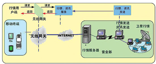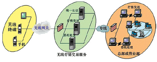 從技術(shù)上說,“移動交易廳”主要采用WAP及專用手機客戶端方式,客戶可以通過訪問證券公司專門申請的域名(如廣發(fā)證券公司的http://wap.gf.com.cn),鏈接到證券公司的WAP手機炒股系統(tǒng)服務(wù)器,下載手機客戶端軟件,然后通過無線接入網(wǎng)關(guān)登錄到移動證券業(yè)務(wù)平臺。移動證券業(yè)務(wù)平臺的行情及委托交易系統(tǒng)完全利用現(xiàn)有的網(wǎng)上交易系統(tǒng)的資源。