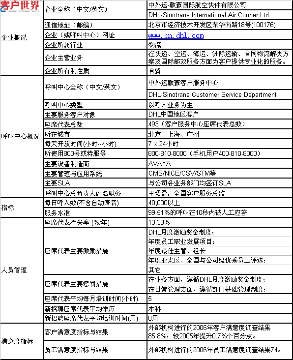 中外運敦豪客戶服務中心一直在逐步建立信息反饋機制和質量管理體系,從而確保服務不斷提升,實現(xiàn)和衡量客戶滿意效果。提供的服務有如下幾個特色:多渠道,通過多媒體客戶互動方式,讓客戶隨時隨地與客戶服務中心暢通聯(lián)系;一站式,通過客戶首次致電解決率和質量監(jiān)控,確保真正達到一站式服務;全天候,全年365天的不間斷熱線服務,確保每次聯(lián)絡都可以迅速理解客戶的需求,提供準確、詳盡的信息和解決方案;個性化,通過主動查詢、專人服務、快件保險等增值服務,讓全球客戶享受個性化解決方案;高績效,擁有經驗豐富的管理團隊,應用標準規(guī)劃客戶服務中心發(fā)展方向和遠景,并通過流程控制、業(yè)務監(jiān)控等方式合理安排工作時間和人員配備,完成和保持DHL亞太區(qū)2003-2006年度的各項績效指標的領先地位;滿意度,為了確保在每一次聯(lián)絡中讓客戶滿意,經過外部專業(yè)咨詢公司的年度客戶滿意度調查結果,中外運敦豪的客戶服務滿意度在物流業(yè)位居首位,公司還每兩年組織一次員工滿意度調查,并通過行動,吸引優(yōu)秀人才繼續(xù)和公司共同發(fā)展。