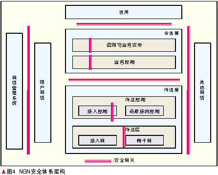 為了給網(wǎng)絡(luò)運營商、業(yè)務(wù)提供商和用戶提供一個安全可信的網(wǎng)絡(luò)環(huán)境,防止各種攻擊,NGN需要避免出現(xiàn)非授權(quán)用戶訪問網(wǎng)絡(luò)設(shè)備上的資源、業(yè)務(wù)和用戶數(shù)據(jù)的情況,需要限制網(wǎng)絡(luò)拓撲結(jié)構(gòu)的可見范圍,需要保證網(wǎng)絡(luò)上傳送的控制信息、管理信息和用戶信息的私密性和完整性,需要監(jiān)督網(wǎng)絡(luò)流量并對異常流量進行管理和上報。