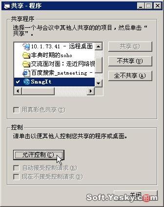 使用“共享”功能的方法是單擊“共享”按鈕,然后在共享程序窗口選擇需要共享的程度或軟件并單擊“答應控制”按鈕,如圖11。