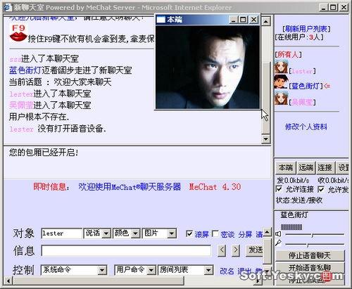 MeChat是由廣州和韻計算機有限公司開發(fā)的視頻聊天服務器。(點這里下載)與一般的采用ASP或CGI的語音聊天室不同,Mechat內(nèi)核由C 編制而成,因而速度奇快,占用服務器系統(tǒng)資源更少。另外,程序內(nèi)建WEB發(fā)布功能,無需再安裝任何WEB服務器、數(shù)據(jù)庫系統(tǒng)支持,即可,完全獨立運行(當然,假如配合Access、MsSQLServer、MySql、Oracle等數(shù)據(jù)庫系統(tǒng),Mechat還可以得到更好的效率)。