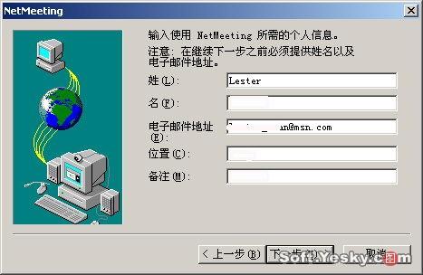 首次運行Netmeeting,軟件會出現(xiàn)一個向?qū)В髮τ脩粜畔⑦M行簡單的設定,單擊下一步,輸入個人信息,如圖4所示: