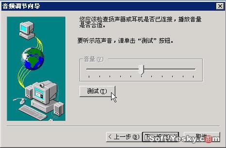 單擊“下一步”跳過Netmeeting服務器設置,此時向?qū)髮τ嬎銠C聲卡和麥克風進行測試,如圖5。