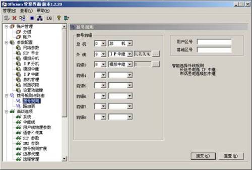 IP PBX 進(jìn)行配置(如圖)。人機(jī)界面簡潔易懂,即便是不懂通訊的外行人,在看過說明書后也能輕松自如地使用。配置起來簡單,例如選擇外線撥號前綴號、做呼叫中心時的ACD輪循分機(jī)線路輪循、回?fù)艿,僅僅選下數(shù)字點下提交,幾秒內(nèi)就可配置結(jié)束。