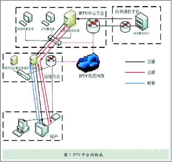 IPTV中心節(jié)點:它是IPTV業(yè)務的播放平臺,它存儲所有的時移節(jié)目、點播內(nèi)容等,同時完成相關(guān)的計費、扣費、權(quán)限管理、菜單發(fā)放等功能。