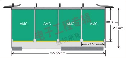 為了提高ATCA設(shè)計(jì)的模塊化性能,PICMG開發(fā)了高級(jí)夾層卡(AMC)規(guī)范。在ATVA卡上放置這些模塊后就可以使它們?cè)L問(wèn)背板連接,因此這些模塊可以用來(lái)定制ATCA卡上的I/O,并用來(lái)裝載處理器和存儲(chǔ)外設(shè)。一塊ATCA卡最多能夠放4個(gè)AMC模塊(見(jiàn)圖1),因此設(shè)計(jì)師用一個(gè)卡即可實(shí)現(xiàn)多種不同的配置。就像ATCA卡一樣,AMC模塊同樣可以實(shí)現(xiàn)單個(gè)模塊的遠(yuǎn)程系統(tǒng)管理和熱交換功能。